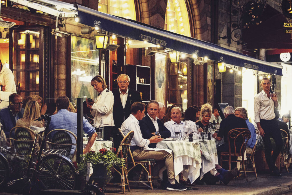 Prinsens uteservering är en liten pärla – vita dukar och en klassisk meny och perfekt läge för att se på stadslivet. Beställ in Prinsens klassiska ljumna sallad och en noga utvald Riesling och se Stockholmssommaren och kvällssolen från första parkett.